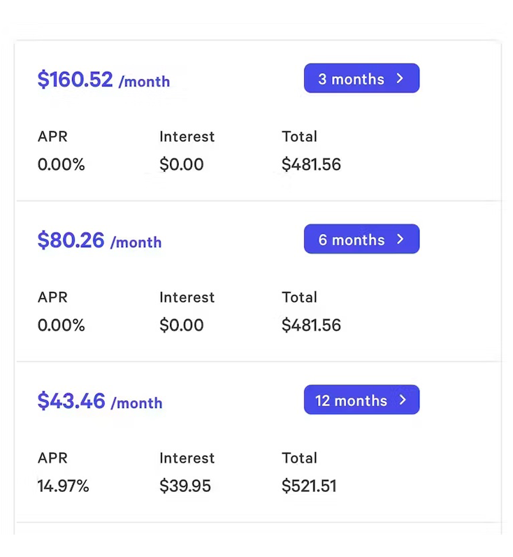 You can choose how long your payments will last. Affirm offers a 3, 6, and 12 month payment plan.